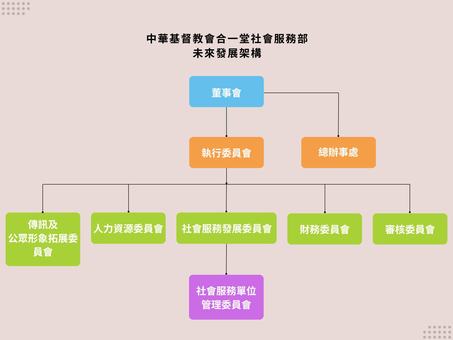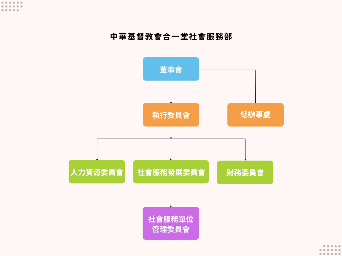 本機構建立了一套明確的管理組織架構,建基於問責機制及有效的資源管理。董事會管理層、總辦事處和社會服務單位透過緊密溝通和相互配合,提供優質的社會服務與支援。